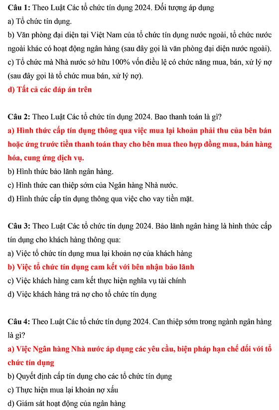 Bộ câu hỏi trắc nghiệm và đáp án Luật Các tổ chức tín dụng năm 2024