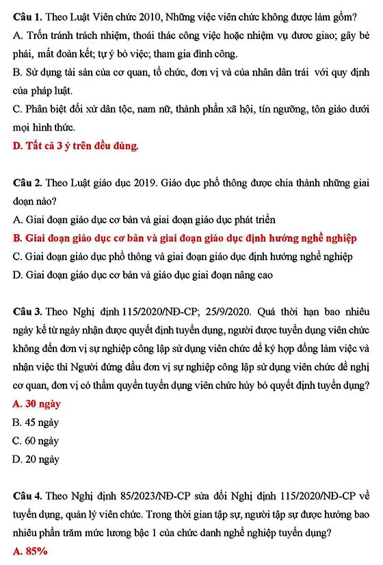 Lưu ý: Sau khi học bộ câu hỏi này bạn có thể thực hiện việc thi thử để kiểm tra lại kiến thức đã học được qua bài thi thử sau: Bài thi thử trắc nghiệm ôn thi viên chức giáo viên Tiểu học quận Long Biên, Hà Nội năm 2025