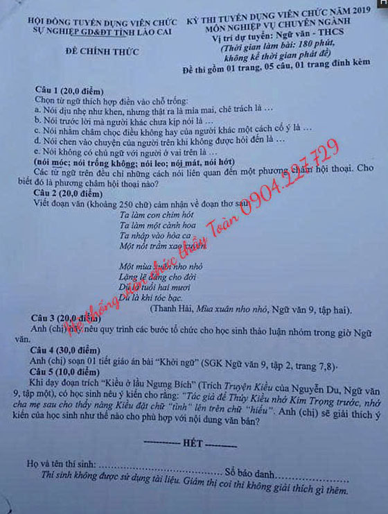 Đề thi viên chức giáo dục tỉnh Lào Cai môn Nghiệp vụ chuyên ngành năm 2019
