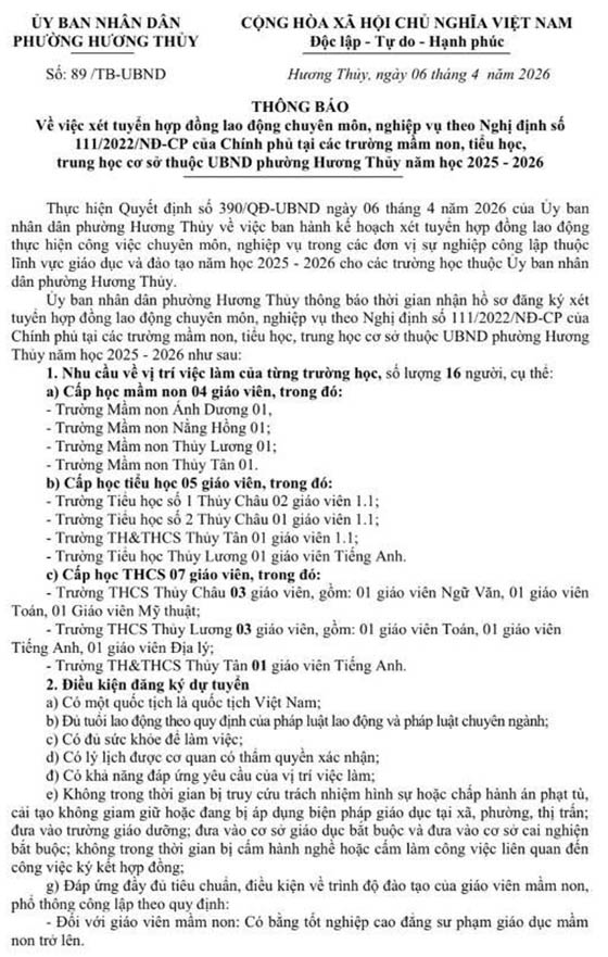 Ủy ban nhân dân phường Hương Thủy thông báo thời gian nhận hồ sơ đăng ký xét tuyển hợp đồng lao động chuyên môn, nghiệp vụ theo Nghị định số 111/2022/NĐ-CP của Chính phủ tại các trường mầm non, tiểu học, trung học cơ sở thuộc UBND phường Hương Thủy năm học 2025 – 2026 như sau:
