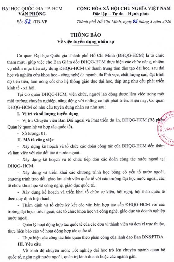 Ngày 05/3/2026, Cơ quan ĐHQG-HCM đã ra thông báo tuyển dụng 01 chuyên viên Ban Đối ngoại và Phát triển dự án (Bộ phận Quản lý quan hệ và hợp tác quốc tế) làm việc tại Nhà Điều hành ĐHQG-HCM.