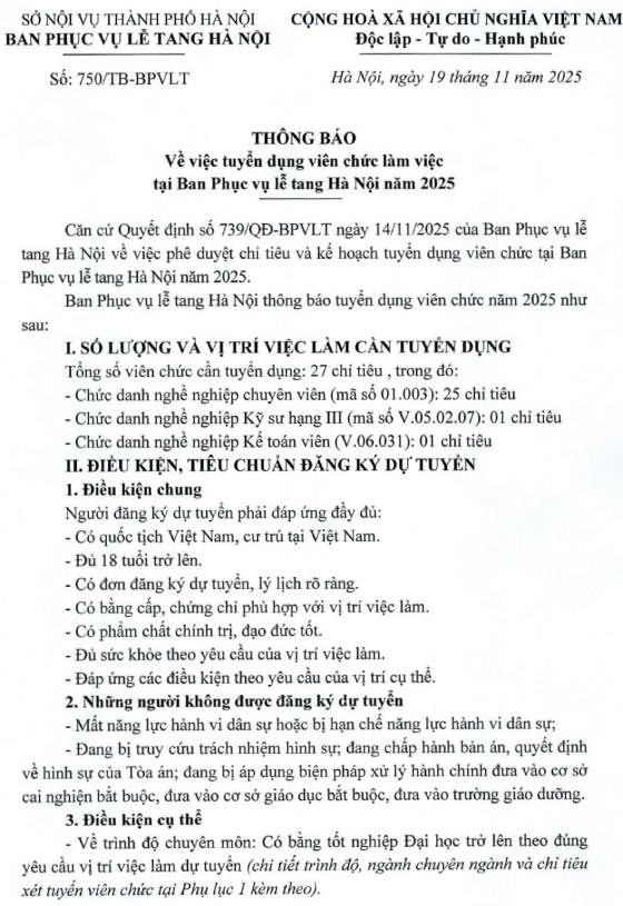 Ban Phục vụ lễ tang Hà Nội thông báo tuyển dụng viên chức năm 2025 như sau: