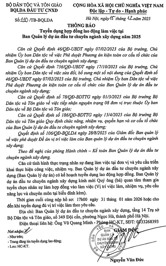 Ban QLDA Đầu tư chuyên ngành xây dựng, Bộ Dân tộc và Tôn giáo tuyển dụng hợp đồng lao động