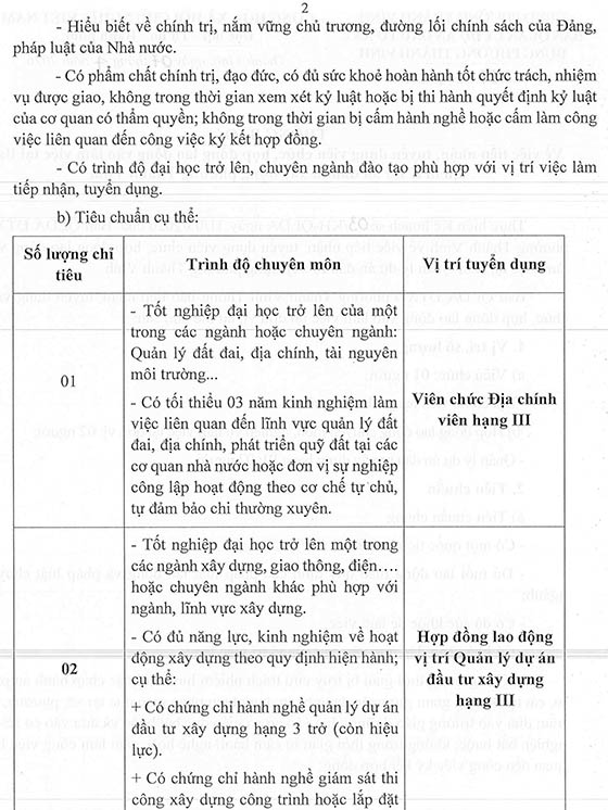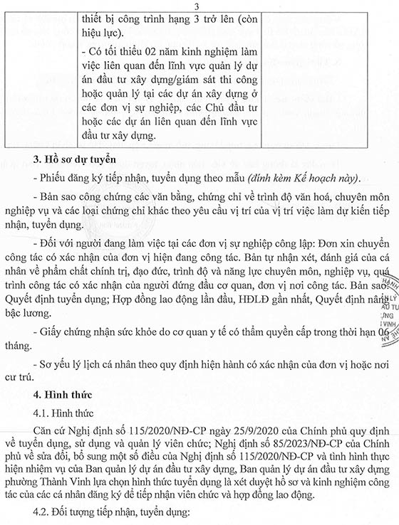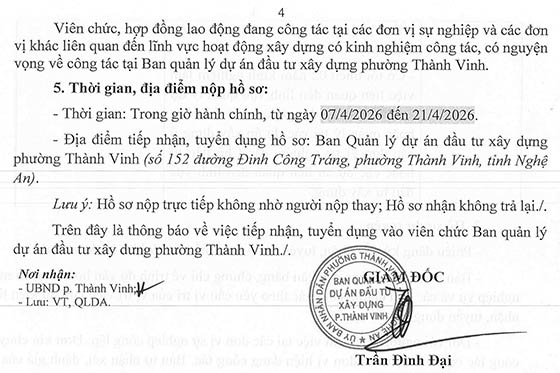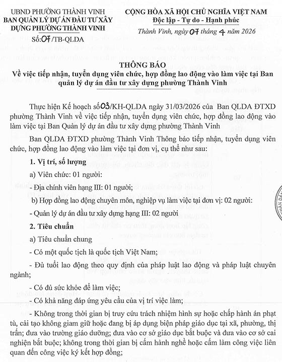 Ban QLDA ĐTXD phường Thành Vinh Thông báo tiếp nhận, tuyển dụng viên chức, hợp đồng lao động vào làm việc tại đơn vị, cụ thể như sau: