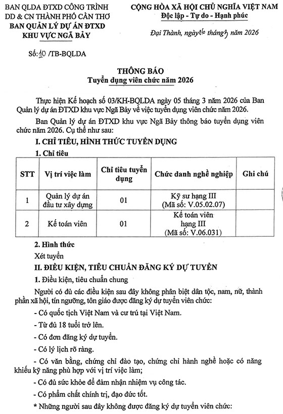Ban Quản lý dự án ĐTXD khu vực Ngã Bảy thông báo tuyển dụng viên chức năm 2026. Cụ thể như sau: