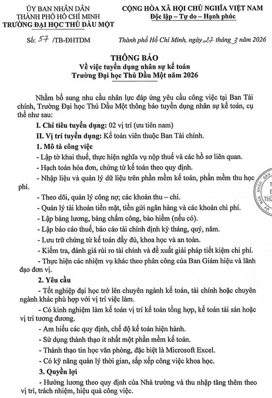 Nhằm bổ sung nhu cầu nhân lực đáp ứng yêu cầu công việc tại Ban Tài chính, Trường Đại học Thủ Dầu Một thông báo tuyển dụng nhân sự kế toán, cụ thể như sau: