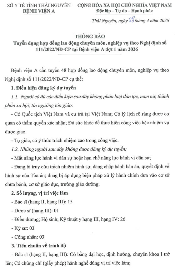 Bệnh viện A Thái Nguyên tuyển dụng hợp đồng lao động năm 2026