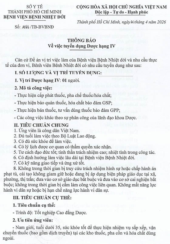 Bệnh viện Bệnh Nhiệt đới có nhu cầu tuyển dụng như sau: