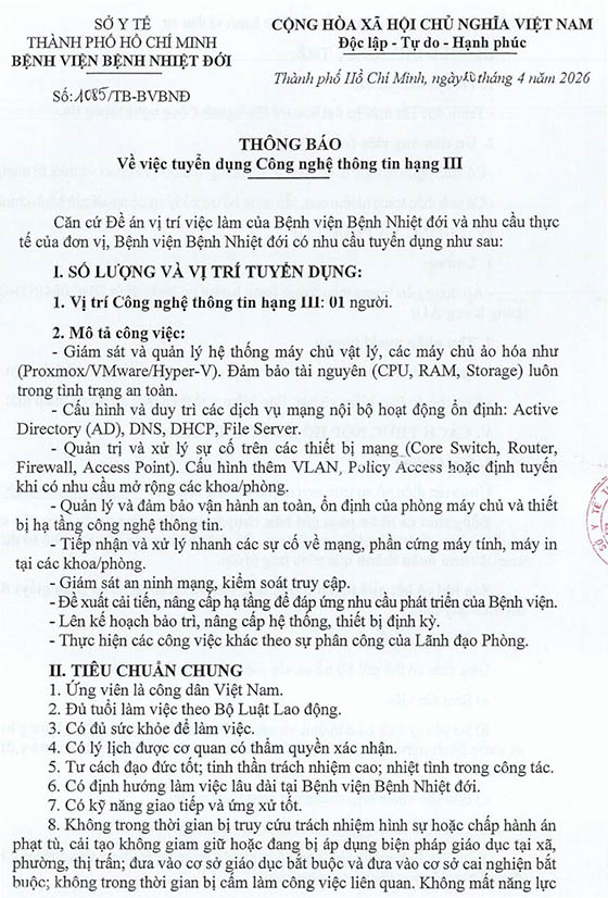 – Địa điểm: Phòng Tổ chức cán bộ, Bệnh viện Bệnh Nhiệt đới, số 764 Võ Văn Kiệt, Phường Chợ Quán, Thành phố Hồ Chí Minh