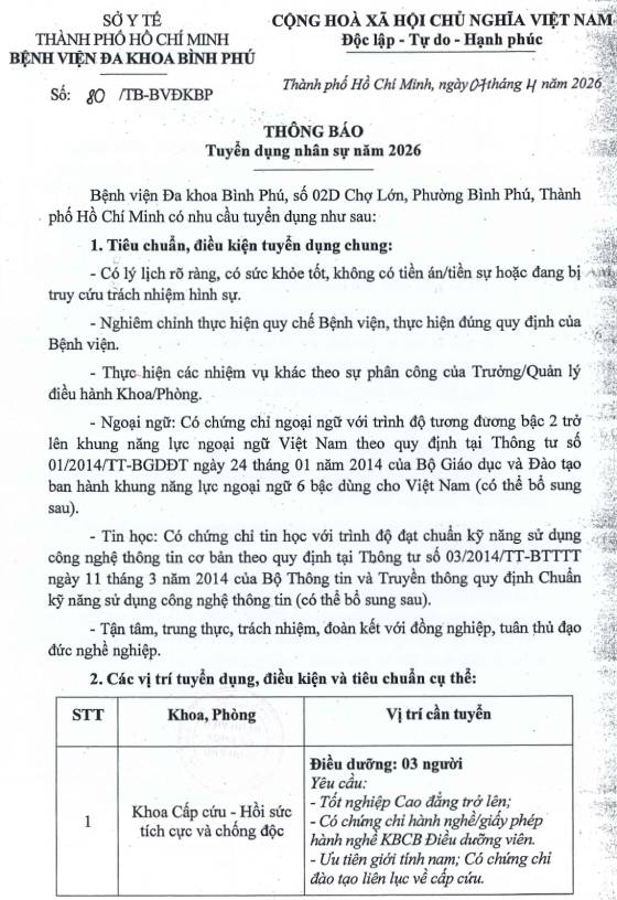 Bệnh viện Đa khoa Bình Phú, số 02D Chợ Lớn, Phường Bình Phú, Thành phố Hồ Chí Minh có nhu cầu tuyển dụng như sau: