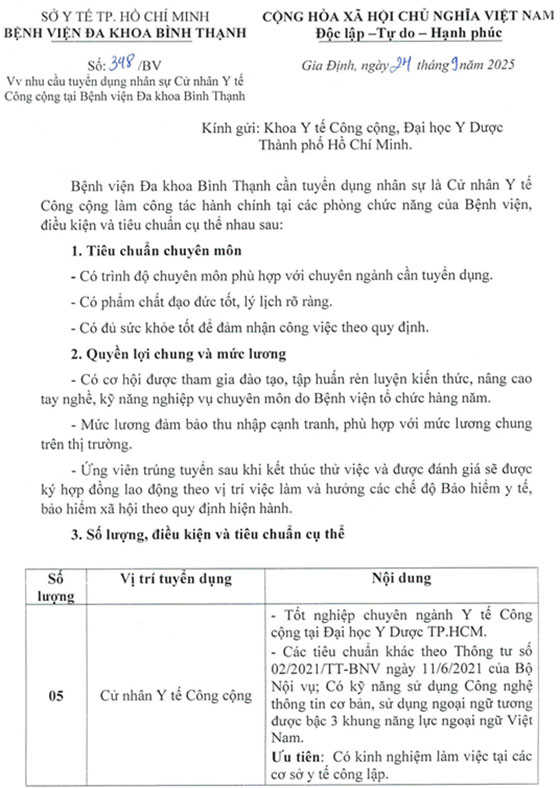 Bệnh viện Đa khoa Bình Thạnh cần tuyển dụng nhân sự là Cử nhân Y tế Công cộng làm công tác hành chính tại các phòng chức năng của Bệnh viện và tiêu chuẩn cụ thể như sau: