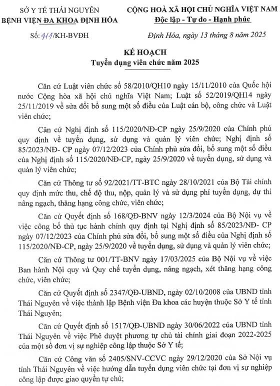 Thực hiện Kế hoạch số 111/KH-BVĐH ngày 13 tháng 8 năm 2025 của Bệnh viện đa khoa Định Hóa về Kế hoạch tuyển dụng viên chức năm 2025.
