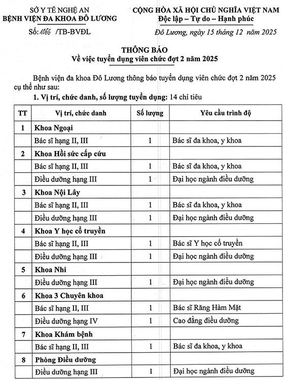Bệnh viện đa khoa Đô Lương thông báo tuyển dụng viên chức đợt 2 năm 2025 cụ thể như sau: