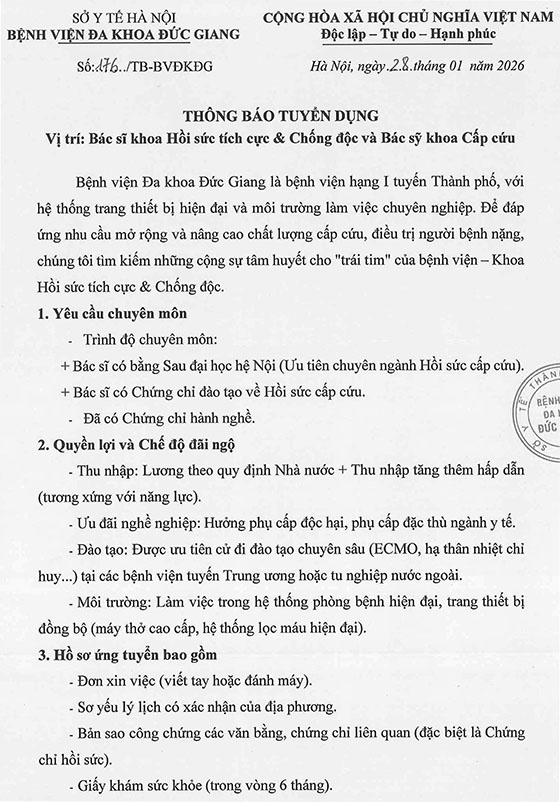 – Cá nhân trực tiếp nộp hồ sơ tại Phòng Tổ chức Cán bộ – Bệnh viện Đa khoa Đức Giang (Tầng 7 Nhà A, Số 54 phố Trường Lâm, Việt Hưng, Hà Nội).