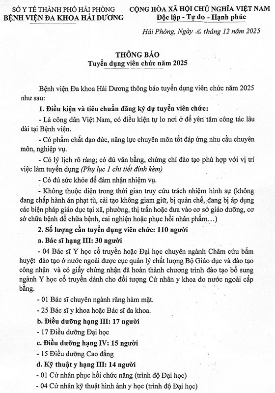 Bệnh viện Đa khoa Hải Dương thông báo tuyển dụng viên chức năm 2025 như sau: