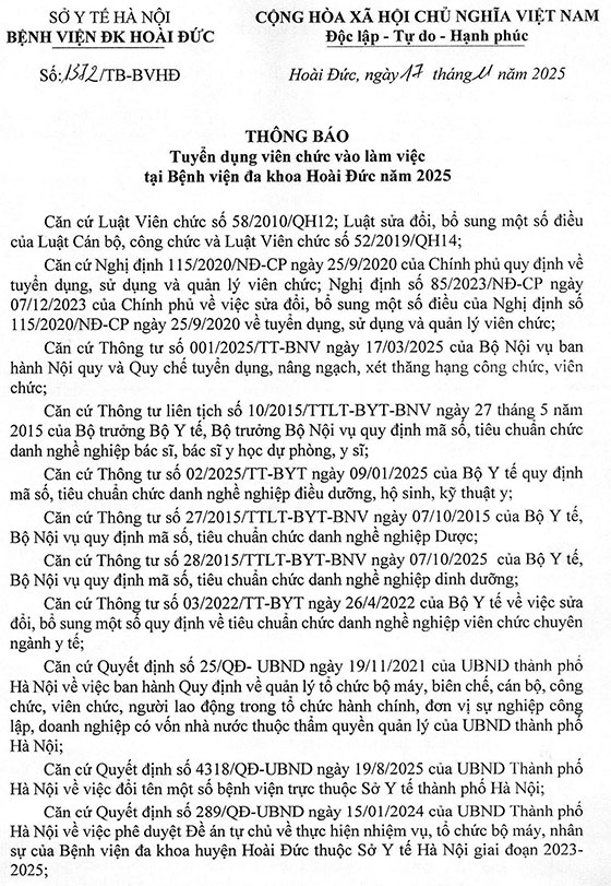 Bệnh viện đa khoa Hoài Đức ban hành Kế hoạch tuyển dụng viên chức vào làm việc tại Bệnh viện đa khoa Hoài Đức năm 2025 như sau: