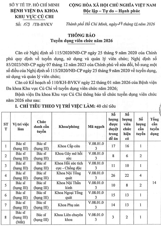 Bệnh viện Đa khoa Khu vực Củ Chi thông báo tổ chức tuyển dụng viên chức năm 2026 như sau: