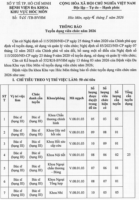 Bệnh viện Đa khoa khu vực Hóc Môn thông báo tuyển dụng viên chức năm 2026, cụ thể như sau: