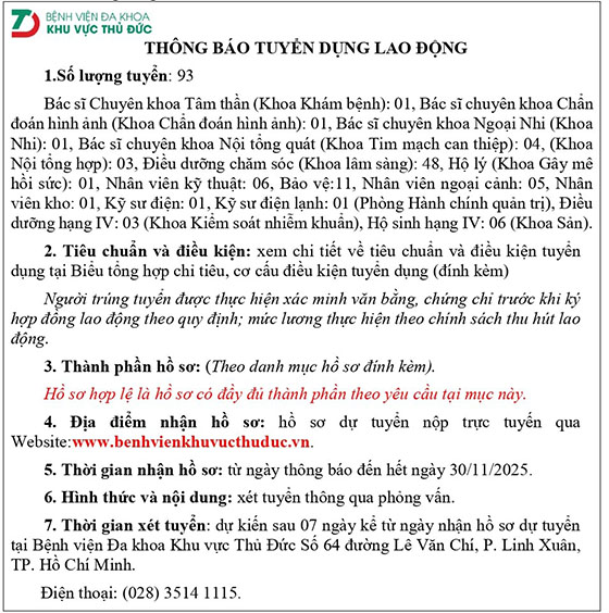 Bệnh viện Đa khoa Khu vực Thủ Đức thông báo tuyển dụng Lao động, cụ thể như sau: