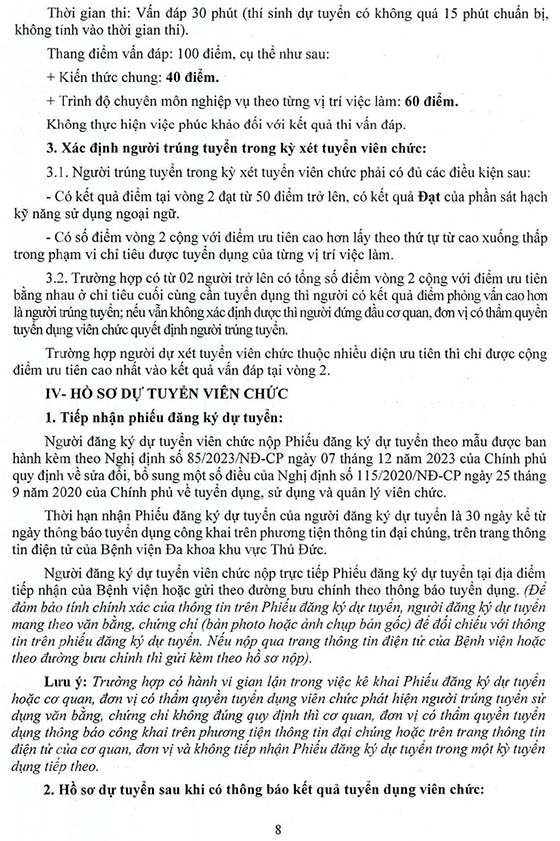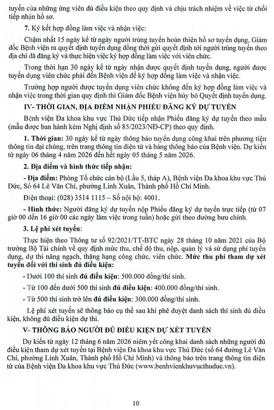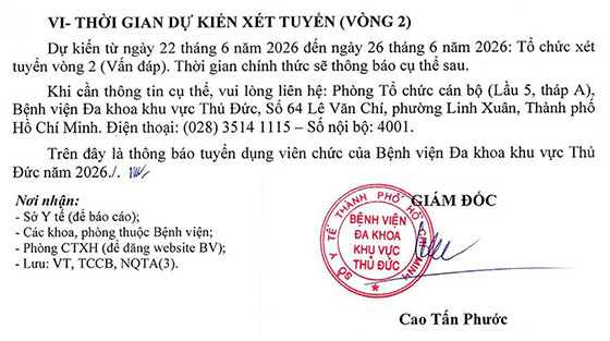 – Địa điểm: Phòng Tổ chức cán bộ (Lầu 5, tháp A), Bệnh viện Đa khoa khu vực Thủ Đức, Số 64 Lê Văn Chí, phường Linh Xuân, Thành phố Hồ Chí Minh.