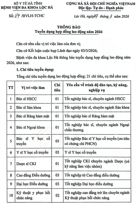 Bệnh viện đa khoa Lộc Hà thông báo tuyển dụng hợp đồng lao động năm 2026, như sau: