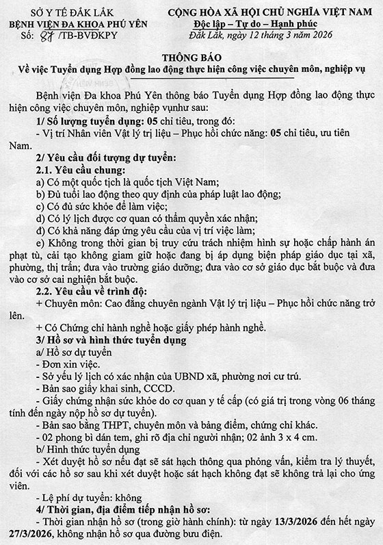 – Địa điểm: Phòng Tổ chức hành chính, Bệnh viện Đa khoa Phú Yên, 15 Nguyễn Hữu Thọ, Phường Tuy Hòa, tỉnh Đắk Lắk