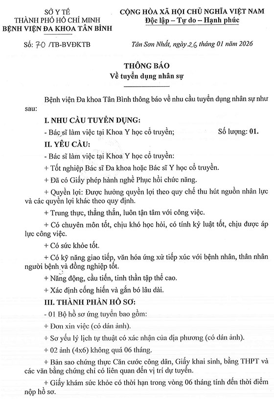 Bệnh viện Đa khoa Tân Bình thông báo về nhu cầu tuyển dụng nhân sự như sau: