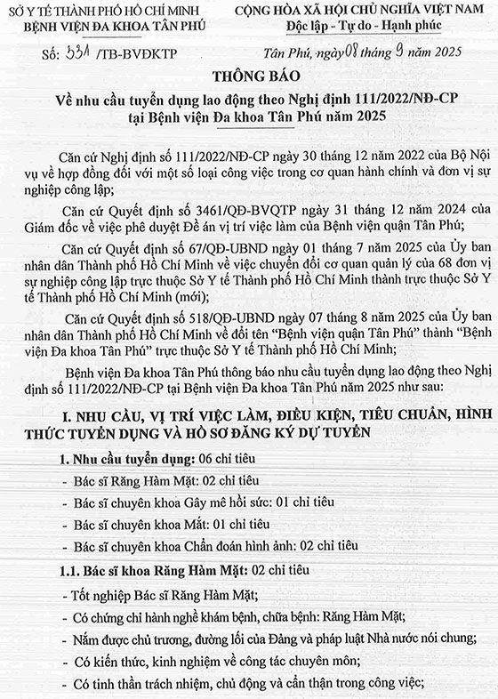 Bệnh viện Đa khoa Tân Phú thông báo nhu cầu tuyển dụng lao động theo Nghị định số 111/2022/NĐ-CP tại Bệnh viện Đa khoa Tân Phú năm 2025 như sau: