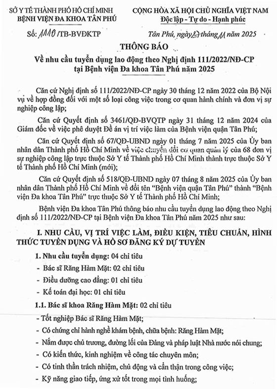Bệnh viện Đa khoa Tân Phú thông báo nhu cầu tuyển dụng lao động theo Nghị định số 111/2022/NĐ-CP tại Bệnh viện Đa khoa Tân Phú năm 2025 như sau: