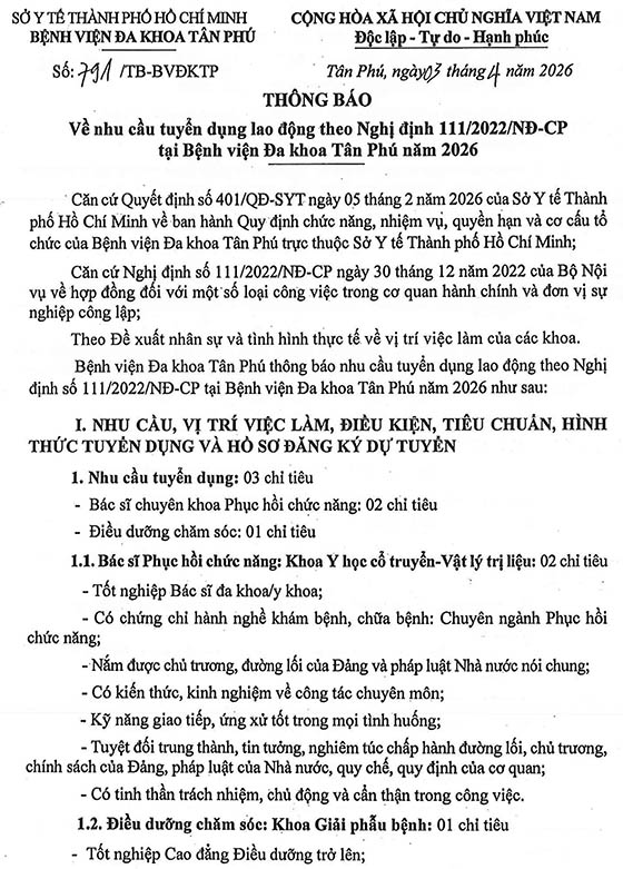 Bệnh viện Đa khoa Tân Phú thông báo nhu cầu tuyển dụng lao động theo Nghị định số 111/2022/NĐ-CP tại Bệnh viện Đa khoa Tân Phú năm 2026 như sau: