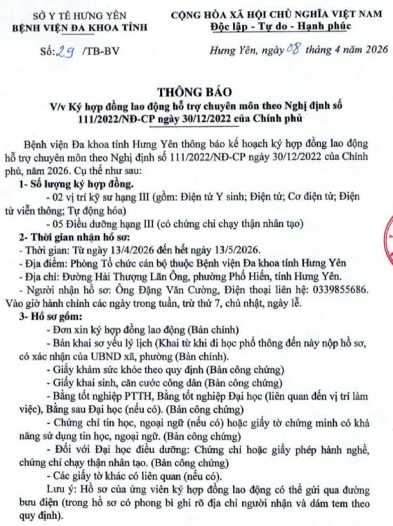 Căn cứ Nghị định số 111/2022/NĐ-CP ngày 30/12/2022 của Chính phủ quy định về chế độ hợp đồng đối với một số loại công việc trong cơ quan hành chính và đơn vị sự nghiệp công lập, Bệnh viện Đa khoa tỉnh Hưng Yên thông báo tuyển dụng hợp đồng lao động hỗ trợ chuyên môn năm 2026, với các nội dung cụ thể như sau: