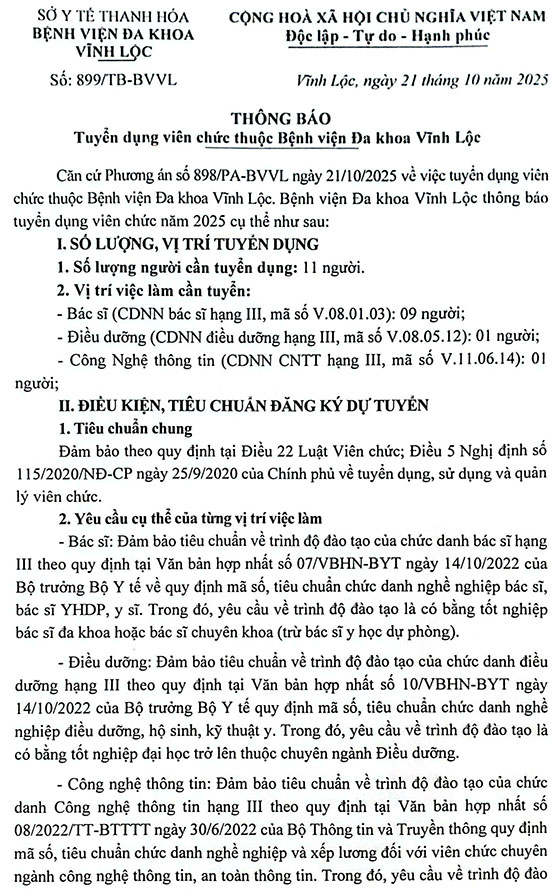Căn cứ Phương án số 898/PA-BVVL ngày 21/10/2025 của Bệnh viện Đa khoa Vĩnh Lộc về việc tuyển dụng viên chức năm 2025. Bệnh viện Đa khoa Vĩnh Lộc thông báo tuyển dụng viên chức năm 2025 cụ thể như sau: