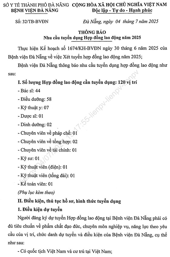 Bệnh viện Đà Nẵng thông báo nhu cầu tuyển dụng hợp đồng lao động như sau: