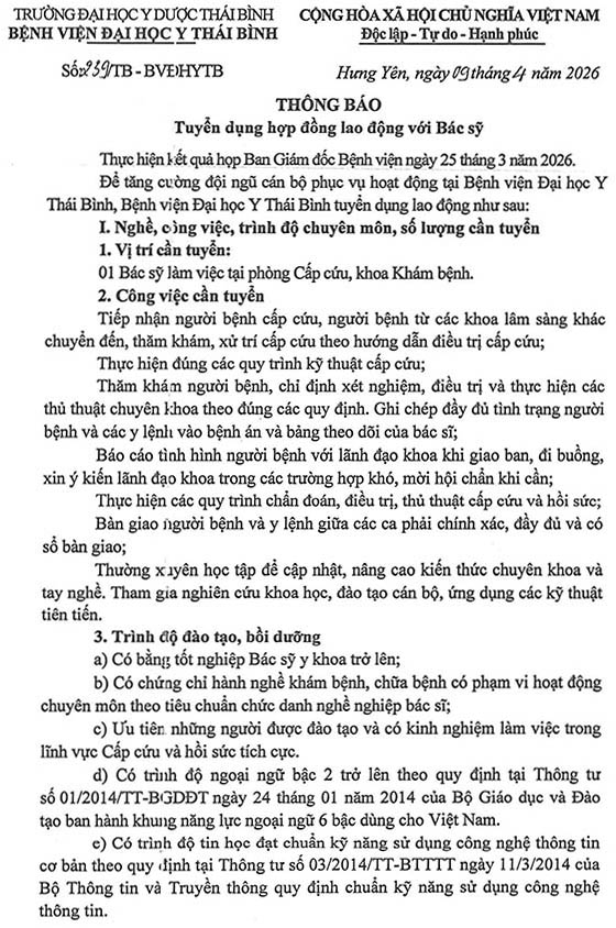 Để tăng cuờng đội ngũ cán bộ phục vụ hoạt động tại Bệnh viện Đại học Y Thái Bình, Bệnh viện Đại học Y Thái Bình tuyển dụng lao động như sau: