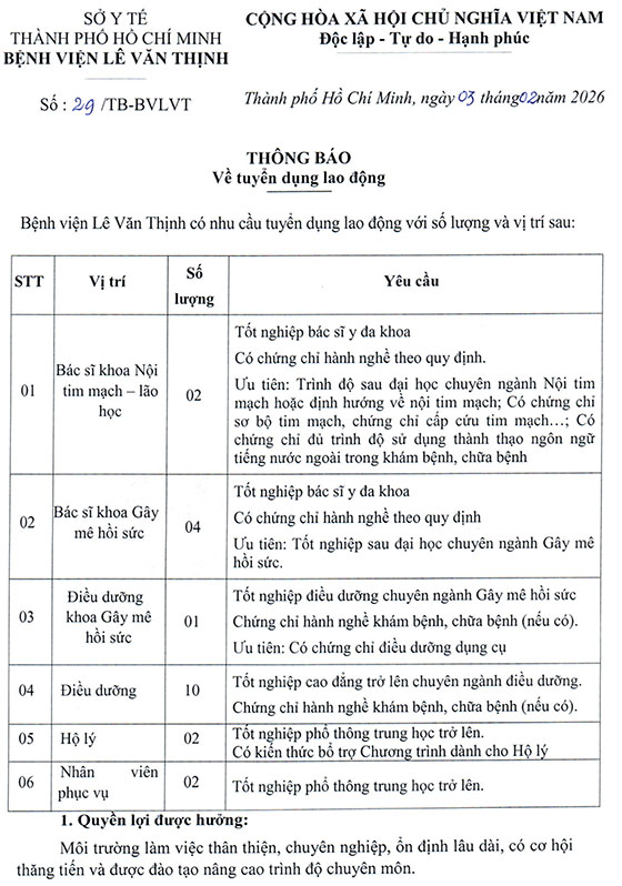 Bệnh viện Lê Văn Thịnh, TP. HCM tuyển dụng lao động