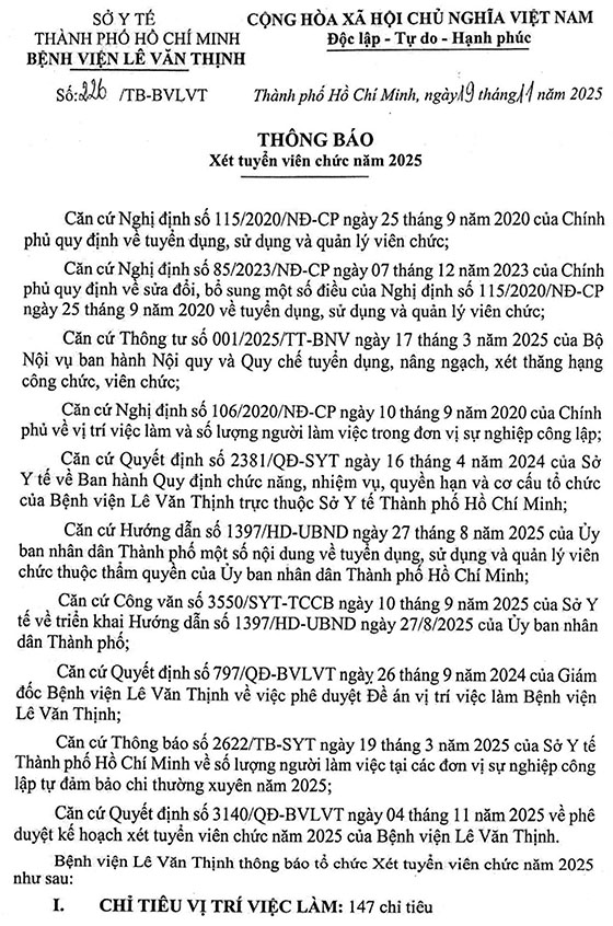Bệnh viện Lê Văn Thịnh, TP. HCM tuyển dụng viên chức năm 2025