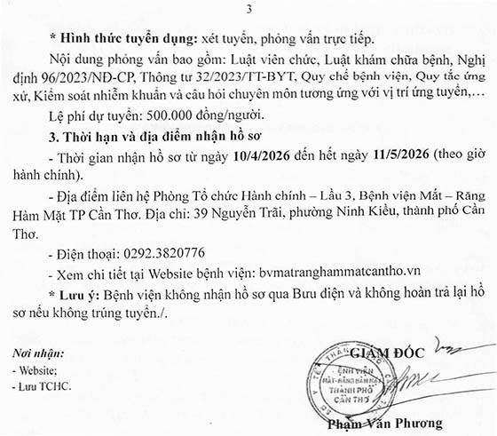 – Địa điểm: phòng Tổ chức Hành chính – Lầu 3, Bệnh viện Mắt — Răng Hàm Mặt TP Cần Thơ. Địa chỉ: 39 Nguyễn Trãi, phường Ninh Kiều, thành phố Cần Thơ.