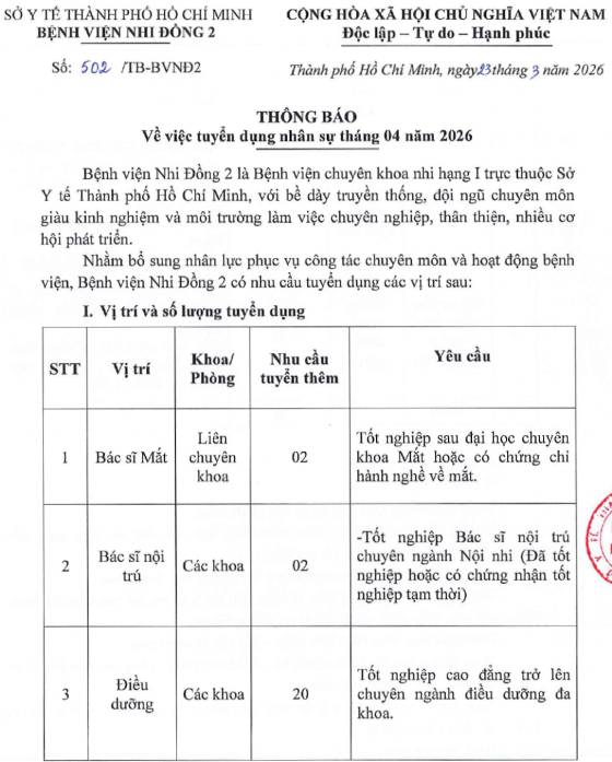 Bệnh viện Nhi Đồng 2, TP. HCM tuyển dụng nhân sự tháng 4 năm 2026
