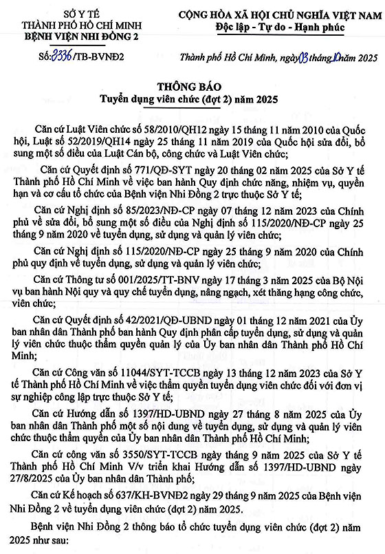 Bệnh viện Nhi Đồng 2 thông báo tổ chức tuyển dụng viên chức (đợt 2) năm 2025 như sau: