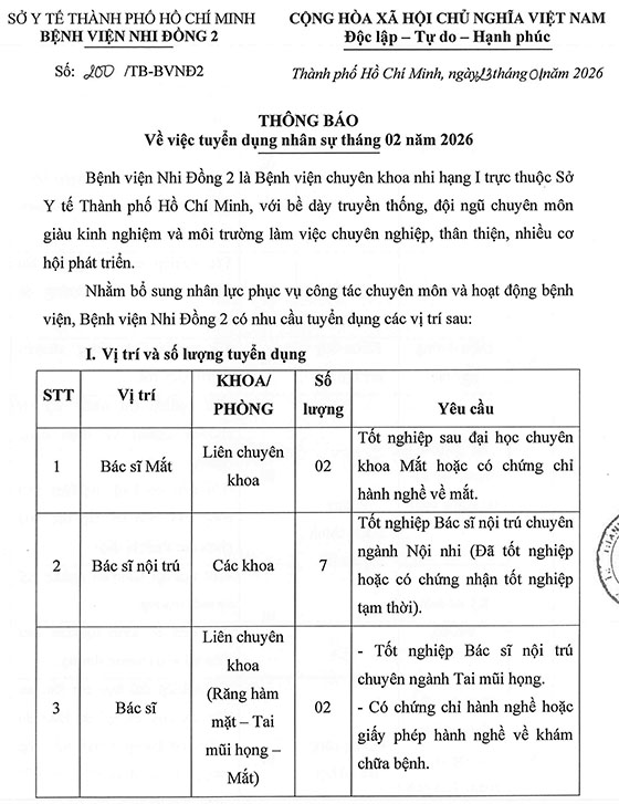 Nhằm bổ sung nhân lực phục vụ công tác chuyên môn và hoạt động bệnh viện, Bệnh viện Nhi Đồng 2 có nhu cầu tuyển dụng các vị trí sau: