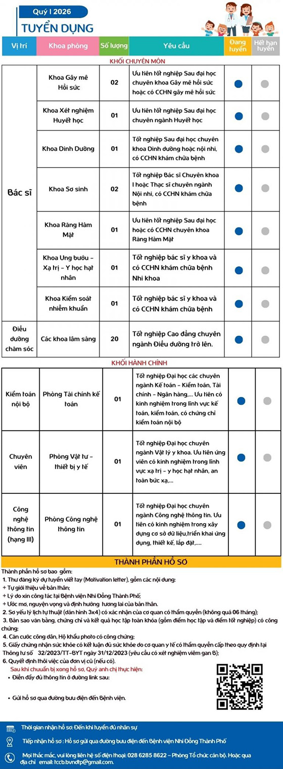 Bệnh viện Nhi đồng Thành phố Hồ Chí Minh tuyển dụng nhân sự Quý I, năm 2026, như sau: