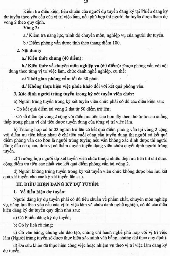 Kiểm tra điều kiện, tiêu chuẩn của người dự tuyển đăng ký tại Phiếu đăng ký dự tuyển theo yêu cầu của vị trí việc làm, nếu phù hợp thì người dự tuyển được tham dự vòng 2 theo quy định.