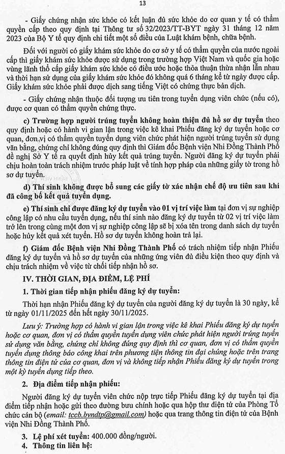 Căn cứ Quyết định số 1358/QĐ-BVNĐTP ngày 27 tháng 10 năm 2025 của Bệnh viện Nhi Đồng Thành Phố về việc phê duyệt Kế hoạch tuyển dụng viên chức năm 2025 của Bệnh viện Nhi Đồng Thành Phố.