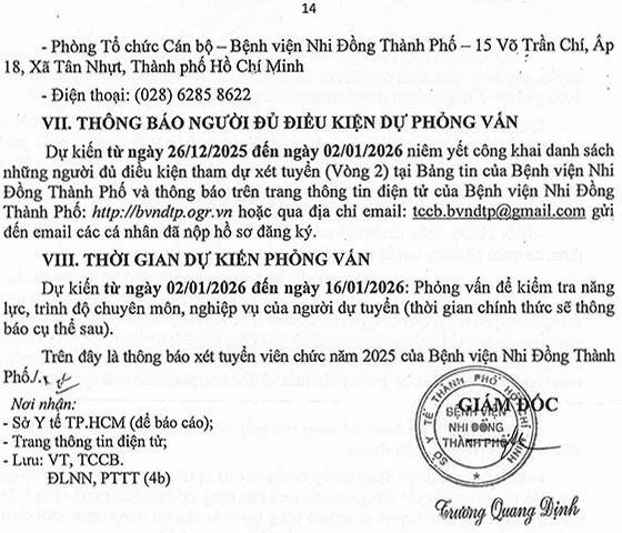 Dự kiến từ ngày 26/12/2025 đến ngày 02/01/2026 niêm yết công khai danh sách những người đủ điều kiện tham dự xét tuyển (Vòng 2) tại Bảng tin của Bệnh viện Nhi Đồng Thành Phố và thông báo trên trang thông tin điện tử của Bệnh viện Nhi Đồng Thành Phố: http://bvndtp.ogr.vn hoặc qua địa chỉ email: tccb.bvndtp@gmail.com gửi đến email các cá nhân đã nộp hồ sơ đăng ký