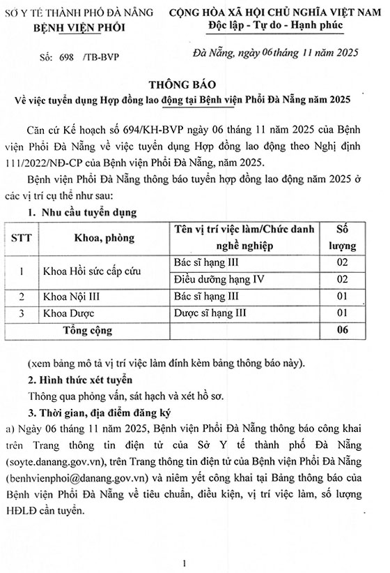 a) Ngày 06 tháng 11 năm 2025, Bệnh viện Phổi Đà Nẵng thông báo công khai trên Trang thông tin điện tử của Sở Y tế thành phố Đà Nẵng (soyte.danang.gov.vn), trên Trang thông tin điện tử của Bệnh viện Phổi Đà Nẵng (benhvienphoi@danang.gov.vn) và niêm yết công khai tại Bảng thông báo của Bệnh viện Phổi Đà Nẵng về tiêu chuẩn, điều kiện, vị trí việc làm, số lượng HĐLĐ cần tuyển.