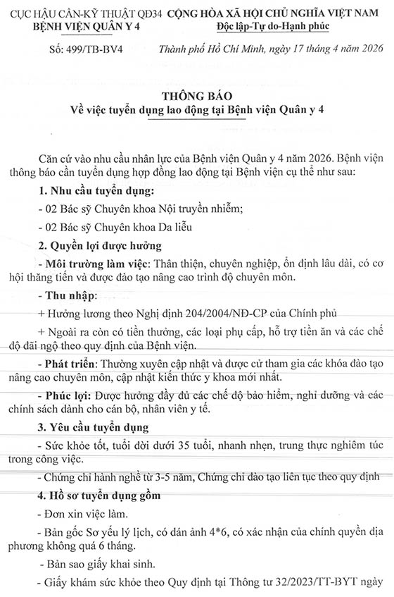 Hạn nộp hồ sơ đến hết ngày 02 tháng 5 năm 2026 tại Tổ CTXH, Bệnh viện Quân y 4.