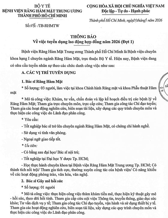 Bệnh viện Răng Hàm Mặt Trung ương TP. HCM tuyển dụng nhân sự
