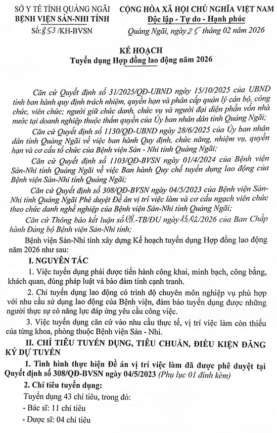 Căn cứ Kế hoạch số 853/KH-BVSN ngày 25/02/2026 của Bệnh viện Sản- Nhi tỉnh Quảng Ngãi ban hành Kế hoạch tuyển dụng hợp đồng lao động năm 2026.