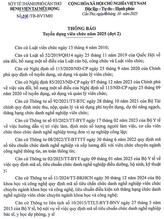 Bệnh viện Tai Mũi Họng thành phố Cần Thơ thông báo tuyển dụng viên chức đợt 2 năm 2025 như sau: