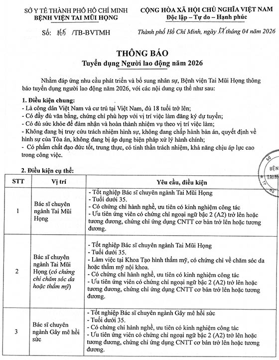Bệnh viện Tai Mũi Họng thông báo tuyển dụng người lao động năm 2026, với các nội dung cụ thể như sau: